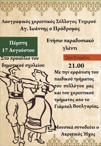 Ο Λαογραφικός Χορευτικός Σύλλογος Τυχερού Άγ. Ιωάννης ο Πρόδρομος” σας προσκαλεί στην ετήσια καλοκαιρινή παραδοσιακή εκδήλωση του την Πέμπτη 17 Αυγούστου 2017 και ώρα έναρξης 21:00.