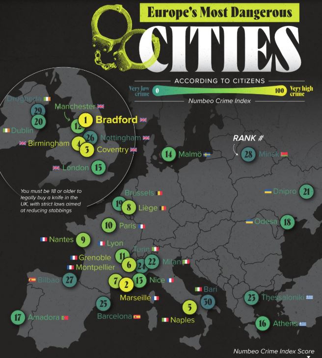 Τέσσερις από τις πέντε κορυφαίες πόλεις — Μπράντφορντ, Κόβεντρι, Μπέρμιγχαμ και Λονδίνο — βρίσκονται στο Ηνωμένο Βασίλειο. Το Μπράντφορντ ηγείται της λίστας με δείκτη εγκληματικότητας 67,1 τον υψηλότερο στην Ευρώπη.