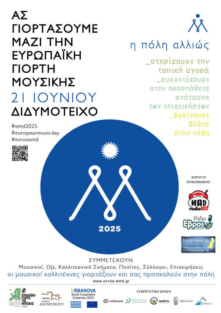 ΕUROPEAN_MUSIC_DAY – Το Διδυμότειχο συμμετέχει ξανά στις 21 ΙΟΥΝΙΟΥ στην πανευρωπαϊκή μαζική εκδήλωση «ΕΥΡΩΠΑΪΚΗ ΓΙΟΡΤΗ ΤΗΣ ΜΟΥΣΙΚΗΣ 2025» με τις τοπικές επιχειρήσεις να στηρίζουν ξανά τον θεσμό και την καλλιτεχνική δημιουργία. Οι μουσικοί, Djs, καλλιτεχνικά σχήματα, πολίτες, σύλλογοι και φορείς συναντιούνται στην πόλη σε μια μέρα γεμάτη μελωδίες και θετική ενέργεια δημιουργώντας μια «ξαφνική μουσική επανάσταση» σε διάφορα σημεία και επιχειρήσεις, το πρωί αλλά και το βράδυ.