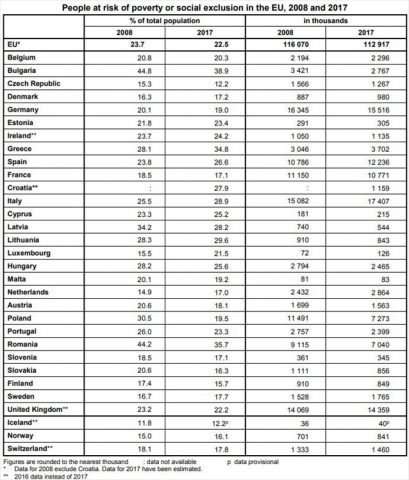Σύμφωνα με τα στοιχεία, που έδωσε στη δημοσιότητα η Eurostat, το 2017 το 22,5% του πληθυσμού της Ε.Ε. ή 112,9 εκατομμύρια άνθρωποι ήταν σε κίνδυνο φτώχειας και αποκλεισμού. Υπενθυμίζεται ότι το ποσοστό αυξανόταν συνεχώς από το 2009, όταν βυθιζόταν η Ευρωζώνη στην ύφεση έως και το 2012, όταν κορυφώθηκε η κρίση χρέους, φτάνοντας στο 25%. Έκτοτε μειώνεται σταδιακά και το 2017 ήταν μία ποσοστιαία μονάδα χαμηλότερα από το 2016 και 1,2 μονάδες χαμηλότερα από το έτος αναφοράς του 2008.