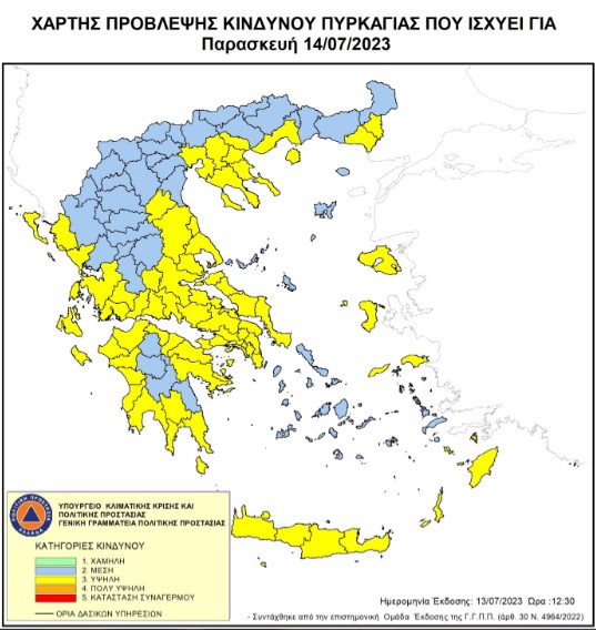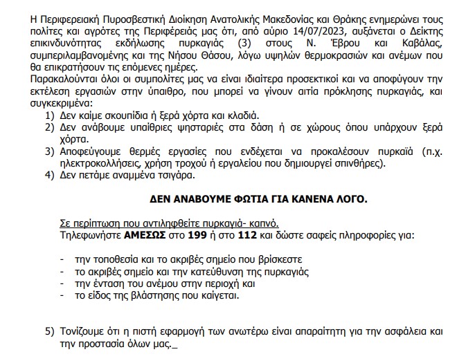 Για την Παρασκευή 14-07-2023 ο Χάρτης Πρόβλεψης Κινδύνου Πυρκαγιάς της Γενικής Γραμματείας Πολιτικής Προστασίας, προβλέπει υψηλό κίνδυνο πυρκαγιάς, κατηγορίας κινδύνου 3 για τις περιοχές των Δασαρχείων Αλεξανδρούπολης και Σουφλίου.