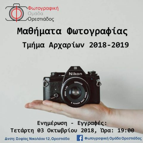 Η Φωτογραφική Ομάδα Ορεστιάδας ανακοινώνει ότι 03 Οκτωβρίου 2018 και ώρα 19:00 θα πραγματοποιηθεί η έναρξη του κύκλου σεμιναρίων για αρχάριους για το έτος 2018-2019. Αν και επιμέρους λεπτομέρειες θα αναπτυχθούν αναλυτικά στη συνάντηση της 03/10/2018, κρίνεται χρήσιμο να γίνουν γνωστά σε όσους θα ήθελαν να παρακολουθήσουν τον κύκλο του σεμιναρίου τα παρακάτω: