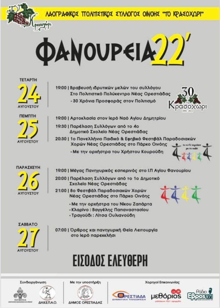 του Δήμου Νέας Ορεστιάδας διοργανώνουν τριήμερες εκδηλώσεις προς τιμήν του Αγίου Φανουρείου