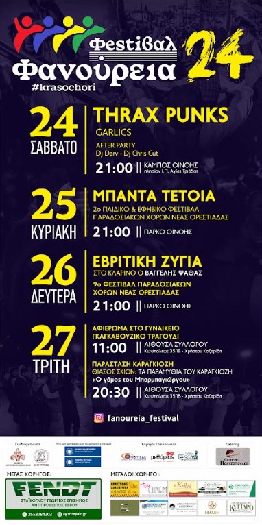 Ο Λαογραφικός Πολιτιστικός Σύλλογος Οινόης “To Κρασοχώρι” σε Συνδιοργάνωση με τον Δήμο Νέας Ορεστιάδας, την Περιφέρεια Ανατολικής Μακεδονίας και Θράκης, υπό την αιγίδα του Υπουργείου Πολιτισμού και Αθλητισμού διοργανώνουν το πολυθεματικό Φεστιβάλ Φανουρεια 2024 προς τιμήν του Αγίου Φανουρίου.