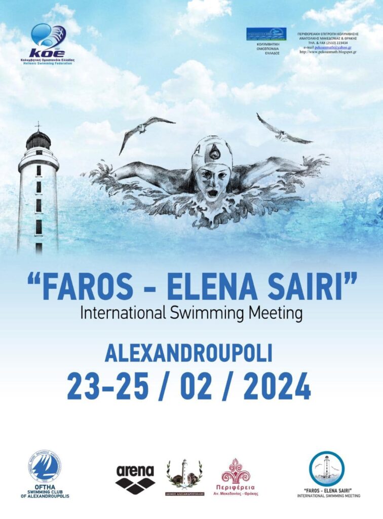 Ο Όμιλος Φίλων Θαλάσσης Αλεξανδρούπολης, με τη συμπαράσταση του Δήμου Αλεξανδρούπολης, της Περιφέρειας Ανατολικής Μακεδονίας και Θράκης, της Κολυμβητικής Ομοσπονδίας Ελλάδος και την υποστήριξη της ARENA, διοργανώνουν για μια ακόμη χρονιά το Διεθνές Κολυμβητικό Μίτινγκ «Φάρος – Έλενα Σαϊρη 2024»