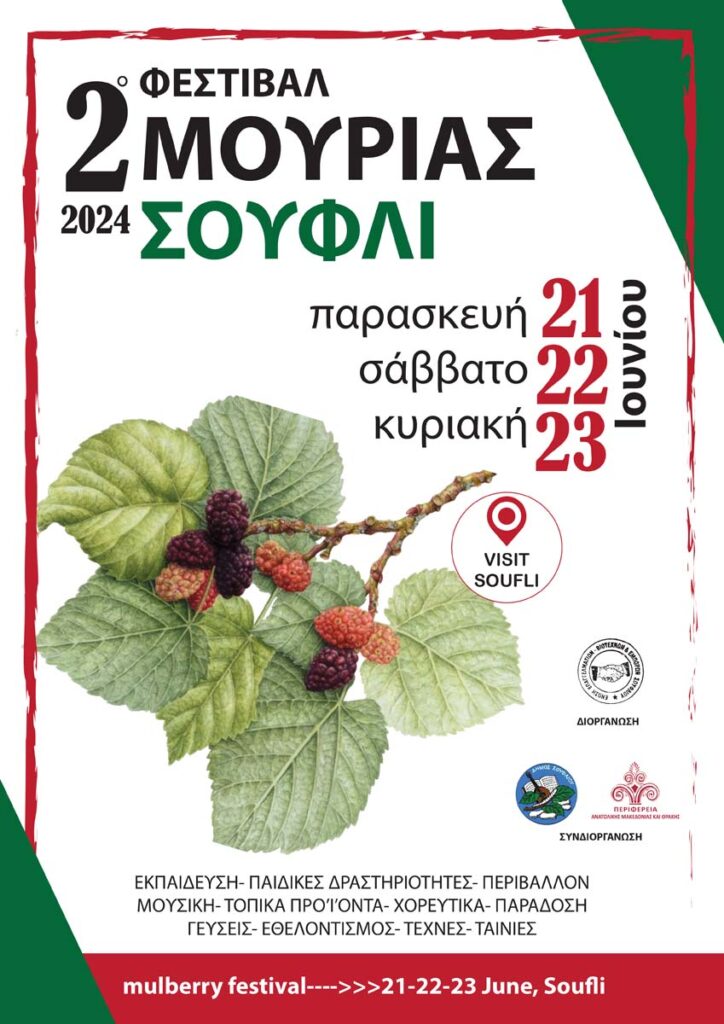 Το 2ο Φεστιβάλ Μουριάς διοργανώνει η Ένωση Επαγγελματιών, Βιοτεχνών και Εμπόρων Σουφλίου τις επόμενες τρεις ημέρες: Παρασκευή 21, Σάββατο 22 και Κυριακή 23 Ιουνίου 2024, στο Σουφλί, στο παρκάκι δίπλα στο Αστυνομικό τμήμα και μπροστά από τα γήπεδα τένις. Ο πρόεδρος της Ένωσης Θοδωρής Τσιαμίτας περιέγραψε τους λόγους, τους στόχους και το περιεχόμενο της διοργάνωσης, απηύθυνε κάλεσμα δε σε μικρούς και μεγάλους να επισκεφθούν το Σουφλί αυτές τις ημέρες υποσχόμενος ξεχωριστές εμπειρίες.