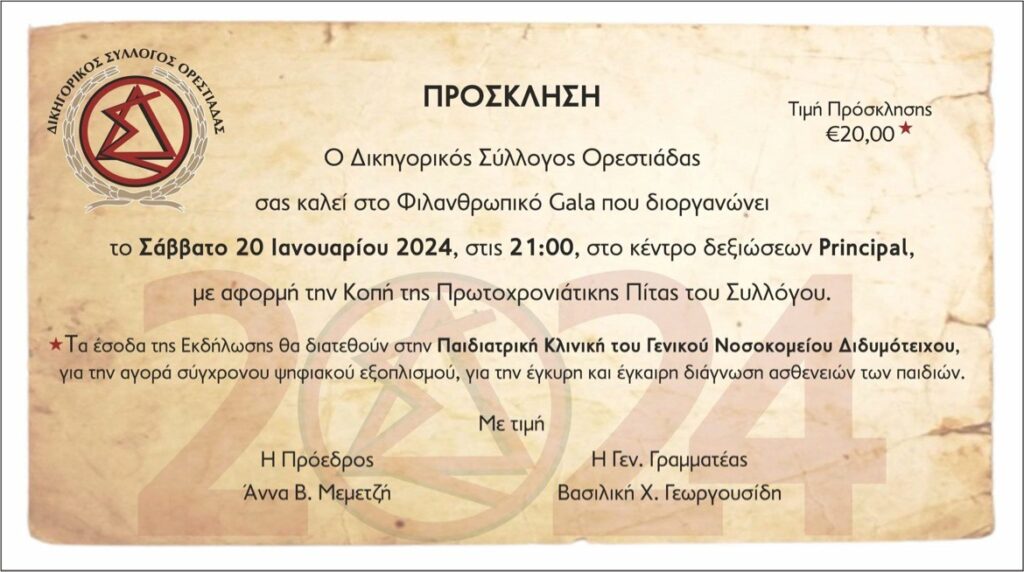 Φιλανθρωπικό Gala διοργανώνει ο Δικηγορικός Σύλλογος Ορεστιάδας με αφορμή την Κοπή της Πρωτοχρονιάτικης Πίτας του Συλλόγου το Σάββατο 20 Ιανουαρίου 2024 στις 21:00 στο Principal.