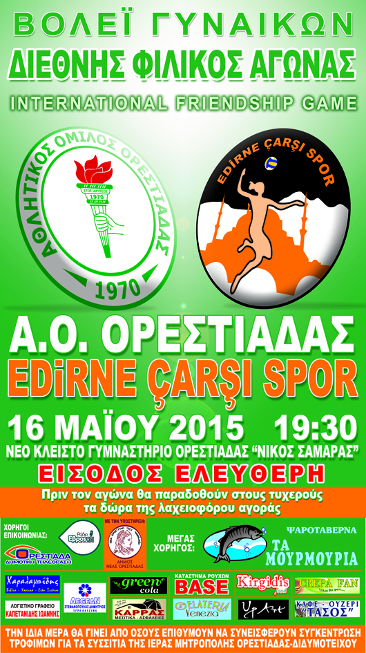 Σε φιλικό αγώνα θα αναμετρηθούν οι γυναικείες ομάδες του Α.Ο.Ορεστιάδας και της Edirne Carsi Spor στις 16 Μαΐου στις 19:30 στο Νέο Κλειστό Γυμναστήριο “Νίκος Σαμαράς” στην Ορεστιάδα.Η είσοδος θα είναι δωρεάν.Πριν τον αγώνα θα γίνει η παράδοση των δώρων στους τυχερούς της λαχειοφόρου αγοράς.(Δείτε εδώ τους τυχερούς αριθμούς της κλήρωσης).