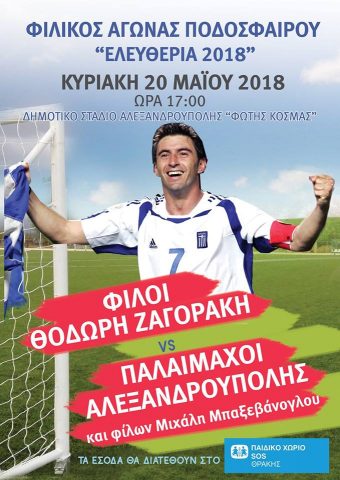 Την Κυριακή 20 Μαΐου και ώρα 17:00 στο πλαίσιο των εκδηλώσεων για τα “Ελευθέρια 2018” θα πραγματοποιηθεί φιλανθρωπικός αγώνας ποδοσφαίρου στο Δημοτικό Στάδιο Αλεξανδρούπολης “Φώτης Κοσμάς” ανάμεσα στους Φίλους Ζαγοράκη και τους Παλαίμαχους Αλεξανδρούπολης & Φίλους Μιχάλη Μπαξεβάνογλου με τα έσοδα να πηγαίνουν στην ενίσχυση του Παιδικού Χωριού SOS Θράκης .