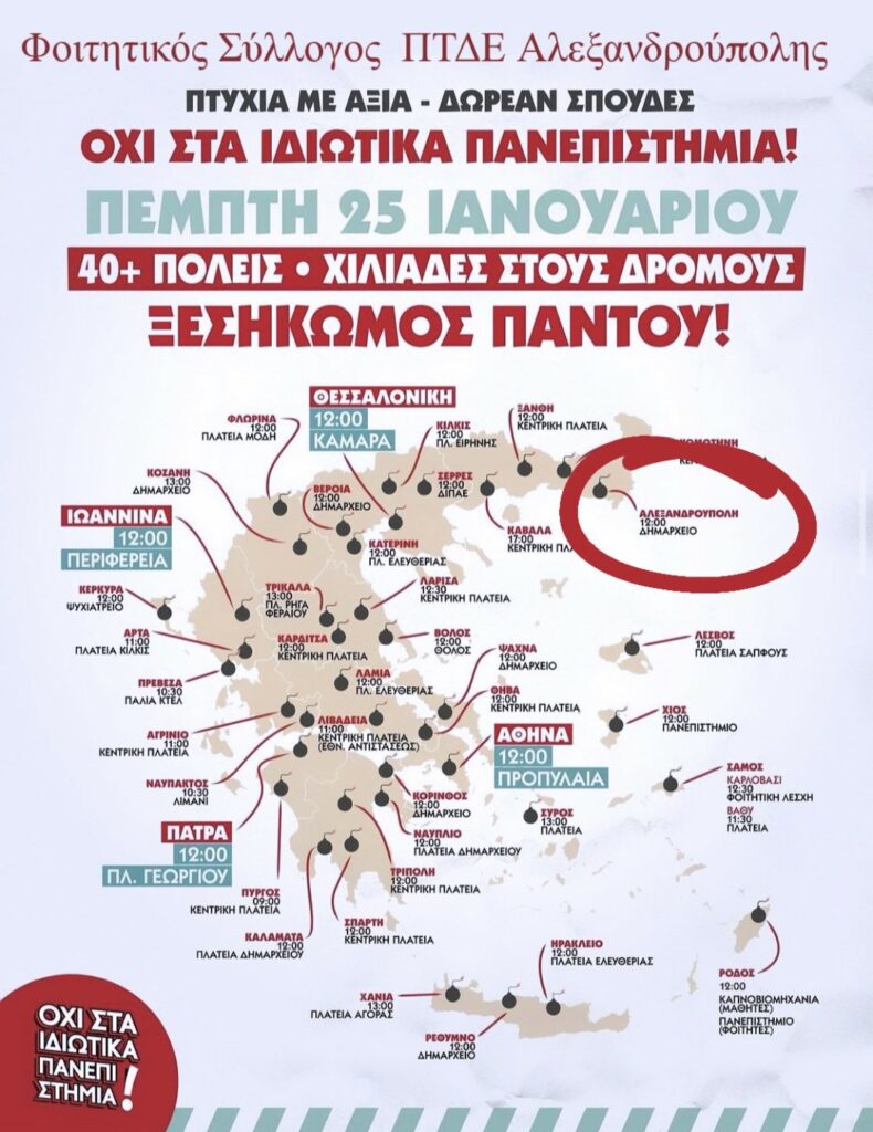 Κάλεσμα των φοιτητών της Αλεξανδρούπολης στο σημερινό συλλαλητήριο ενάντια στα ιδιωτικά πανεπιστήμια