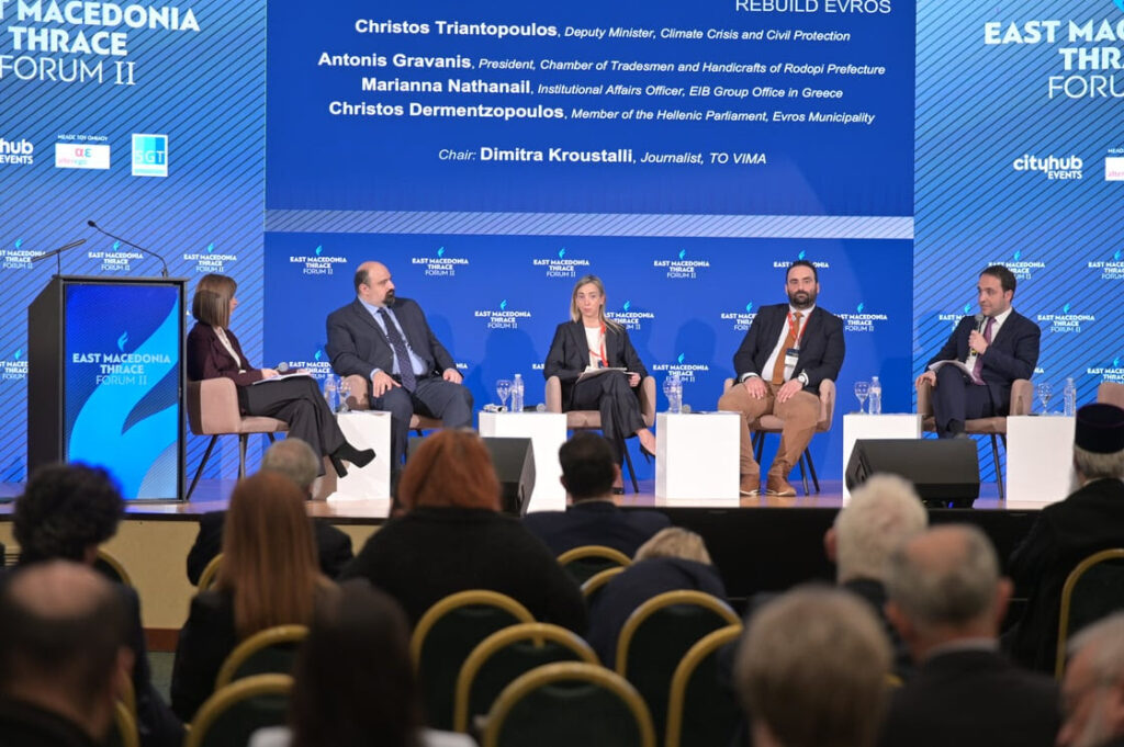 Στα παραπάνω ερωτήματα κλήθηκαν να δώσουν απαντήσεις ο Χρήστος Τριαντόπουλος, Υφυπουργός Κλιματικής Κρίσης και Πολιτικής Προστασίας, αρμόδιος για την Αποκατάσταση από Φυσικές Καταστροφές και την Κρατική Αρωγή, ο Αντώνης Γραβάνης, πρόεδρος του Επαγγελματικού και Βιοτεχνικού Επιμελητηρίου Ροδόπης και η Μαριάννα Ναθαναήλ, Υπεύθυνη Θεσμικών Σχέσεων Ομίλου Ευρωπαϊκής Τράπεζας Επενδύσεων στην Ελλάδα και ο βουλευτής ΝΔ στον Έβρο Χρήστος Δερμεντζόπουλος στο πλαίσιο του East Macedonia & Thrace Forum που διοργανώνεται για δεύτερη συνεχόμενη χρονιά στην Αλεξανδρούπολη, από τη City Hub Events.