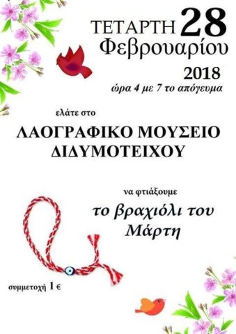 Το Λαογραφικό Μουσείο Διδυμοτείχου καλεί μικρούς και μεγάλους φίλους να φτιάξουν μαζί, όπως και πέρσι έτσι και φέτος, το βραχιολάκι του Μάρτη, το γνωστό ασπροκόκκινο βραχιολάκι από κλωστή που φοράνε τα παιδιά κάθε 1η του Μάρτη!