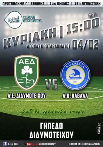 Μεγάλο παιχνίδι την Κυριακή στο Διδυμότειχο με την Α.Ε.Διδυμοτείχου να υποδέχεται στις 15:00 στο Δημοτικό Γήπεδο Διδυμοτείχου την Καβάλα!Στο μεταξύ του παιχνίδι στον πρώτο γύρο υπήρχαν έντονα παράπονα από τους πράσινους για το πέναλτι που σφυρίχτηκε υπέρ των “αργοναυτών” και έκρινε σε μεγάλο βαθμό την επικράτηση τους και το τελικό σκορ! Στο στρατόπεδο των πρασίνων μετά την εκτός έδρας νίκη της προηγούμενης αγωνιστικής (δείτε εδώ τα αποτελέσματα και τον βαθμολογικό πίνακα της 14ης αγωνιστικής) θέλουν να συνεχίσουν τα θετικά αποτελέσματα ώστε να αποφύγουν όσο γίνεται πιο γρήγορα την πιθανότητα του υποβιβασμού. Στον αντίποδα οι φιλοξενούμενοι που έχουν ως στόχο την άνοδο δείχνουν πόσο σοβαρά αντιμετωπίζουν το παιχνίδι διανυκτερεύοντας το Σάββατο στο Διδυμότειχο. Τον αγώνα θα διευθύνει ο Τσοπουλίδης με βοηθούς του τους Εμπλιούκ και Κηλικιώτη αμφότεροι από την Ξάνθη .Δείτε αναλυτικά το πρόγραμμα και τους διαιτητές που όρισε η ΕΠΟ: