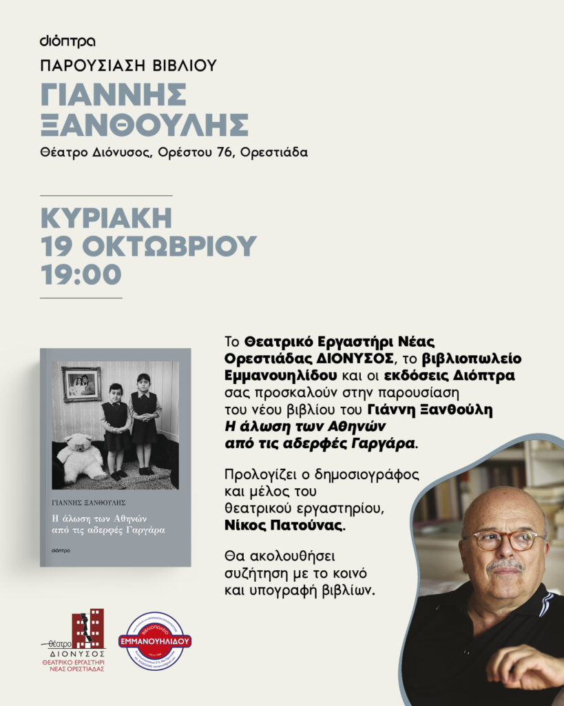 Το Θεατρικό Εργαστήρι Νέας Ορεστιάδας ΔΙΟΝΥΣΟΣ, το βιβλιοπωλείο Εμμανουηλίδου και οι εκδόσεις Διόπτρα σας προσκαλούν στην παρουσίαση του νέου βιβλίου του Γιάννη Ξανθούλη «Η άλωση των Αθηνών από τις αδερφές Γαργάρα», την Κυριακή 19 Οκτωβρίου 2025, στις 19:00, στο Θέατρο ΔΙΟΝΥΣΟΣ (Ορέστου 76, Ορεστιάδα).