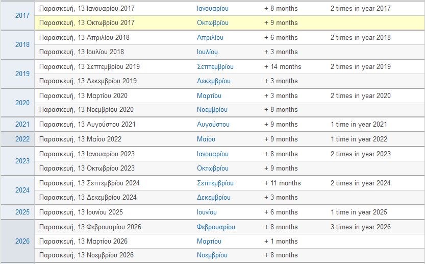 Η Παρασκευή και 13 εμφανίζεται από μία έως τρεις φορές κατά τη διάρκεια ενός έτους, ανάλογα το πως συνδυάζεται η ημερομηνία στην κάθε χρονιά,φέτος “έπεσε” τον Ιανουάριο, ενώ αυτό θα συμβαίνει μέχρι και το 2020. Το 2021, το 2022 και το 2025 θα την συναντήσουμε μόνο μία φορά, ενώ το 2026 τρεις!