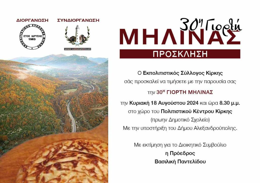 Ο Εκπολιτιστικός Σύλλογος Κίρκης σάς προσκαλεί προκαλεί να τιμήσετε με την παρουσία σας την 30η ΓΙΟΡΤΗ ΜΗΛΙΝΑΣ την Κυριακή 18 Αυγούστου 2024 και ώρα 8:30 μ.μ. στο χώρο του Πολιτιστικού Συλλόγου Κίρκης (πρώην Δημοτικό Σχολείο)