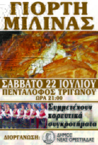 Το Σάββατο 22 Ιουλίου 2017 και ώρα 21:00 θα γίνει στο γήπεδο Πενταλόφου η “Γιορτή Μιλίνας”, ένας διαγωνισμός για την καλύτερη μιλίνα – πίτα, σε διοργάνωση του Δήμου Ορεστιάδας και με την συμμετοχή συλλόγων γυναικών από εννέα χωριά του Τριγώνου!