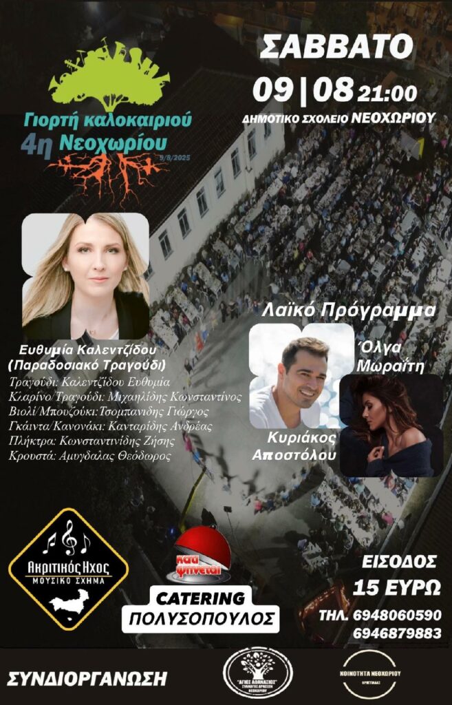 Ο Σύλλογος Δράσεων Νεοχωρίου «ΑΓΙΟΣ ΑΘΑΝΑΣΙΟΣ» διοργανώνει την 4η Γιορτή Καλοκαιριού Νεοχωρίου το Σάββατο 9 Αυγούστου 2025 και ώρα 21:00 το βράδυ στην αυλή του Δημοτικου Σχολείου Νεοχωρίου .