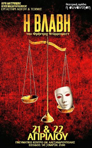 Στη “Βλάβη” o δεξιοτέχνης Ελβετός συγγραφέας Friedrich Durrenmatt συνδυάζει το κωμικό με το τραγικό, το μακάβριο και το γκροτέσκο και προτείνει έναν ορισμό: Δικαιοσύνη…η πιο φρικαλέα έμμονη ιδέα, που στο όνομα της οι άνθρωποι σφάζουν ο ένας τον άλλο…