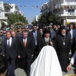 Μετά την υποδοχή του στην πλατεία ακολούθησε πομπή, με συνοδεία παιδιών που παρέλασαν, μέχρι την εκκλησία των Αγίων Θεοδώρων. Μιλώντας στον Ιερό Ναό, όπου και τελέστηκε πανηγυρική δοξολογία, ο Οικουμενικός Πατριάρχης αναφέρθηκε, μεταξύ άλλων, στην ηθική και πνευματική διάσταση της κρίσης και στη «δυσχερή αυτή περίοδο» για τη χώρα και τον λαό, προτρέποντάς τον να εμπνευστεί από την υπομονή και την καρτερία που επέδειξε ο εορτάζοντας Άγιος Ευστάθιος και να αντλήσει δύναμη και θάρρος από τη στάση του και από το παράδειγμα των ευσεβών προγόνων, ώστε «να ανταπεξέλθωμεν εις τας δυσκολίας και να εξέλθουμε νικηφόροι εκ της παρούσης δοκιμασίας».