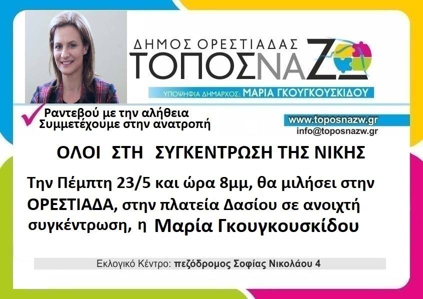 Την Πέμπτη 23-5-2019 και ώρα 20:00 θα μιλήσει στην πλατεία Δασίου στην Ορεστιάδα σε ανοιχτή συγκέντρωση, η Μαρία Γκουγκουσκίδου υποψήφια Δήμαρχος με τον συνδυασμό Δήμος Ορεστιάδας Τόπος Να Ζω.