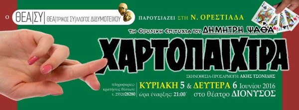 Μετά τη μεγάλη επιτυχία στο Διδυμότειχο,η “ΧΑΡΤΟΠΑΙΧΤΡΑ” ταξιδεύει στη Ν.Ορεστιάδα στο θέατρο ΔΙΟΝΥΣΟΣ μόνο για δύο παραστάσεις το Σάββατο 5 και τη Κυριακή 6 Ιουνίου στις 9 το βράδυ.