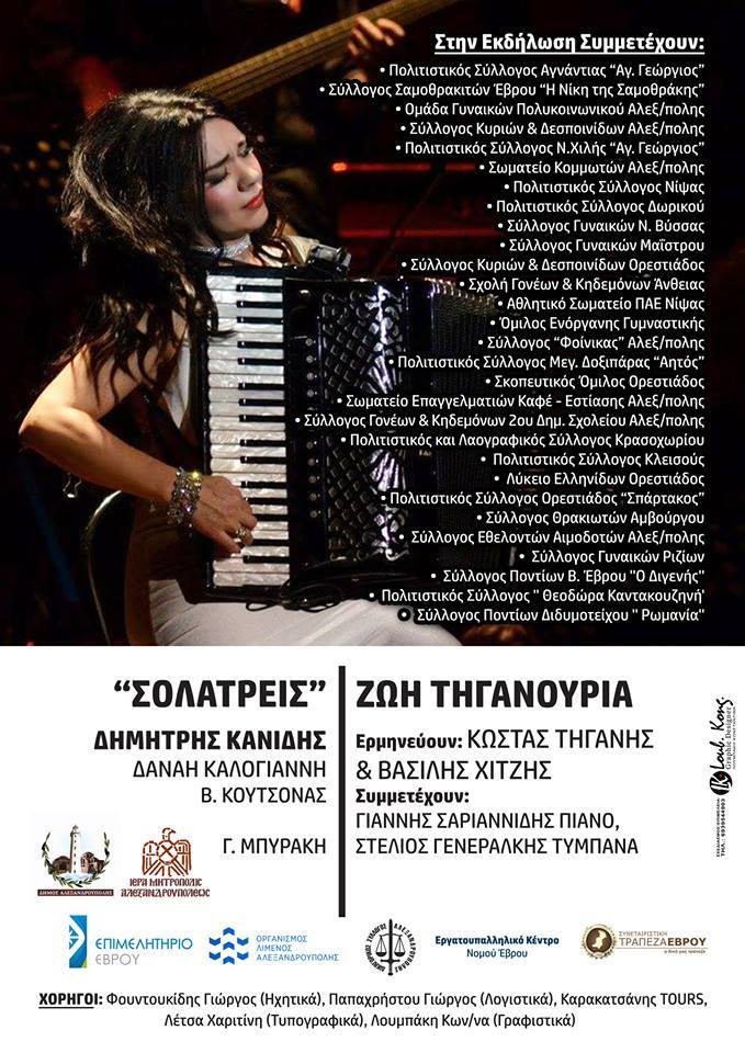 Η εκδήλωση στήριξης θα πραγματοποιηθεί την Παρασκευή 10 Νοεμβρίου 2017 στις 7 μ.μ. στο Δημοτικό Θέατρο Αλεξανδρούπολης με την Ζωή Τηγανούρια και ένα επιτελείο καλλιτεχνών, οι οποίοι δείχνουν έμπρακτα την αμέριστη συμπαράσταση τους συμμετέχοντας αφιλοκερδώς.