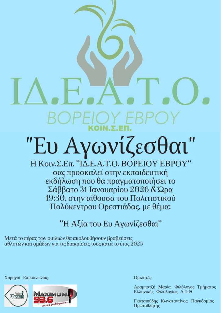 Η Κοιν.Σ.Επ. «ΙΔ.Ε.Α.Τ.Ο. ΒΟΡΕΙΟΥ ΕΒΡΟΥ» σας προσκαλεί στην εκπαιδευτική εκδήλωση που διοργανώνει με θέμα: «Η Αξία του Ευ Αγωνίζεσθαι»