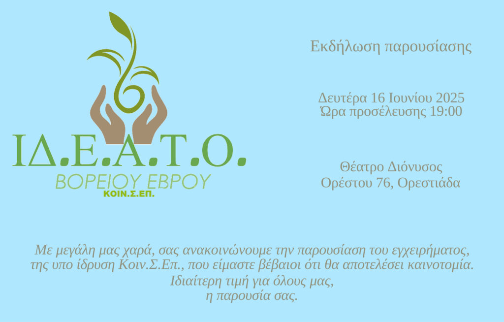 Εκδήλωση παρουσίασης της υπό ίδρυση Κοιν.Σ.Επ. “ΙΔ.Ε.Α.Τ.Ο. ΒΟΡΕΙΟΥ ΕΒΡΟΥ” θα πραγματοποιηθεί την Δευτέρα 16 Ιουνίου 2025 και ώρα 19:00, στην Ορεστιάδα, στο Θέατρο Διόνυσος (Ορέστου 76)