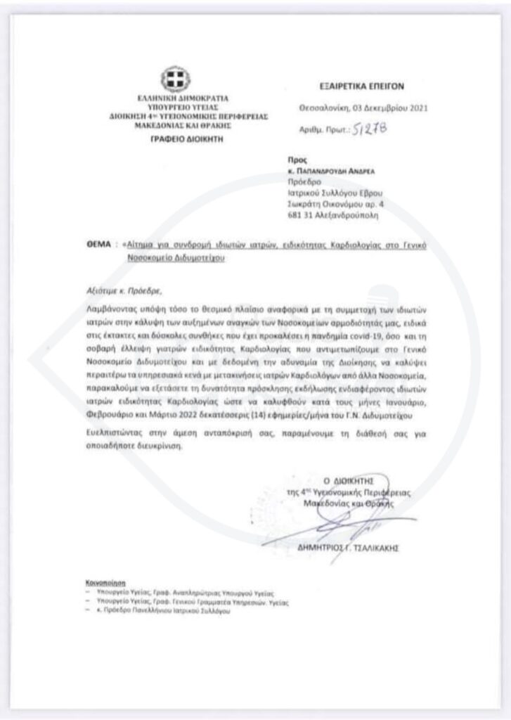 Ως ύστατη λύση στο πρόβλημα, η 4η ΥΠΕ με επιστολή της στον πρόεδρο του Ιατρικού Συλλόγου Έβρου Ανδρέα Παπανδρούδη του ζητά να μεριμνήσει ώστε να καλύψουν ιδιώτες τις εφημερίες τριών μηνών (Ιανουαρίου, Φεβρουαρίου, Μαρτίου), παραδεχόμενη “την αδυναμία της Διοίκησης να καλύψει περαιτέρω τα υπηρεσιακά κενά με μετακινήσεις ιατρών Καρδιολόγων από άλλα νοσοκομεία”.