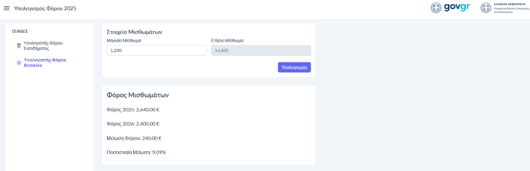 Κάθε πολίτης μπορεί να επιλέξει τον Υπολογιστή Φόρου Εισοδήματος που εμφανίζεται στην αρχική οθόνη ή τον Υπολογιστή Φόρου Ενοικίου.