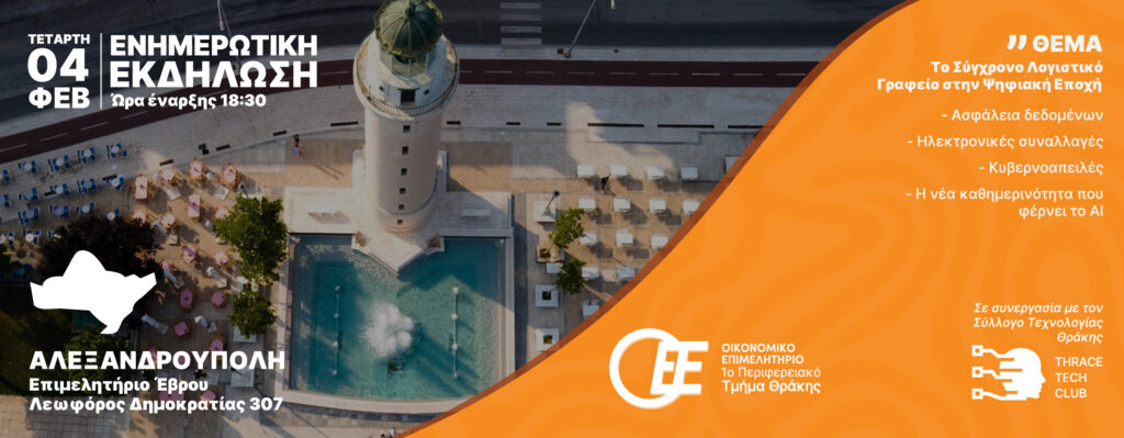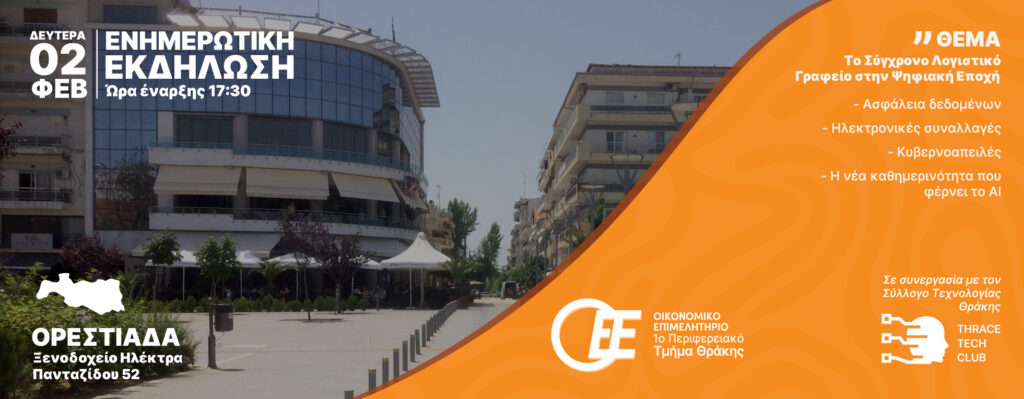 Το Οικονομικό Επιμελητήριο Ελλάδος – Περιφερειακό Τμήμα Θράκης, σε συνεργασία με τον Σύλλογο Τεχνολογίας Θράκης, διοργανώνει ημερίδα με θέμα: «Το Σύγχρονο Λογιστικό Γραφείο στην Ψηφιακή Εποχή – Ασφάλεια δεδομένων, ηλεκτρονικές συναλλαγές, κυβερνοαπειλές και η νέα πραγματικότητα που φέρνει η Τεχνητή Νοημοσύνη».
