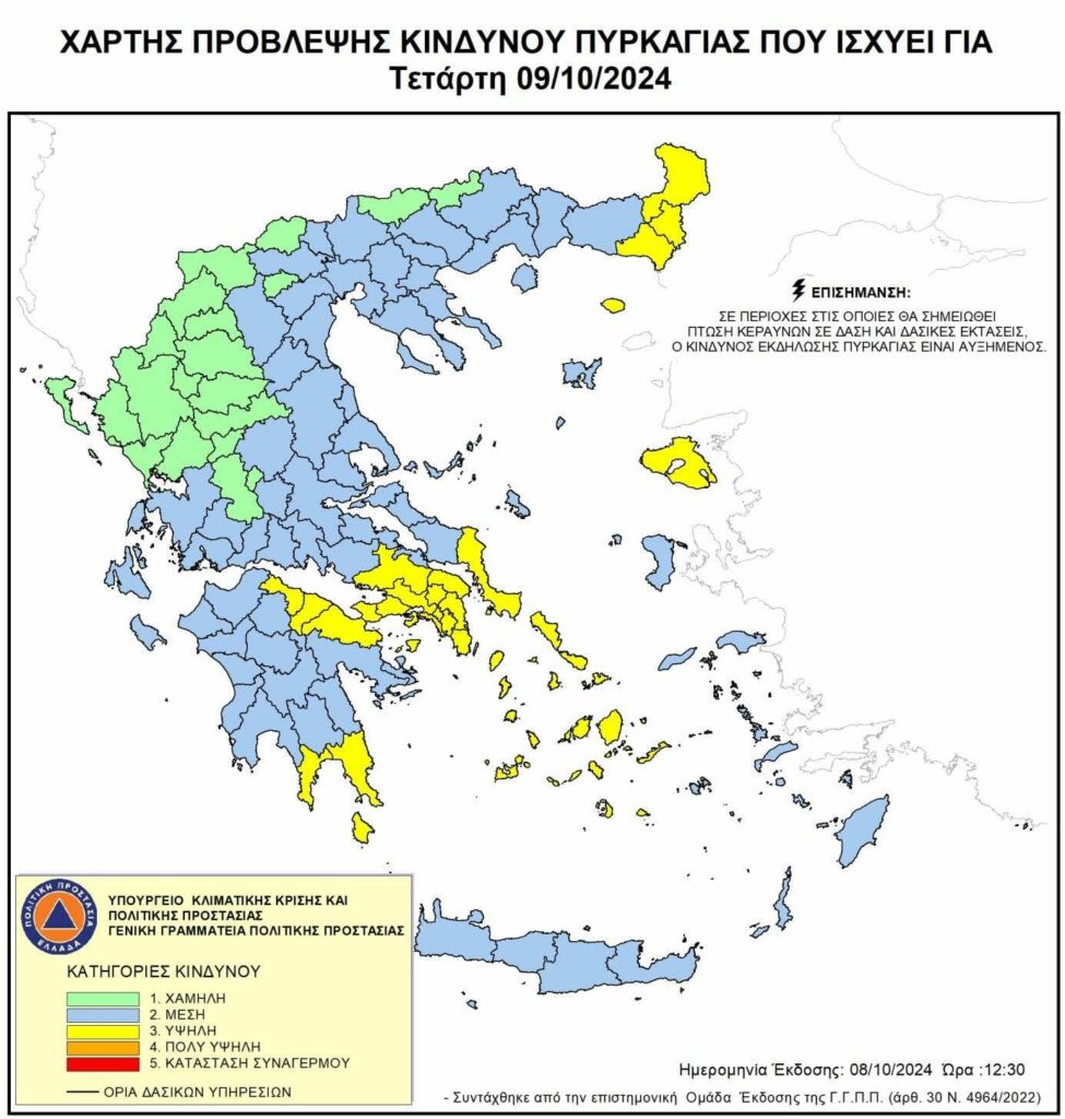 Για σήμερα, Τετάρτη 9 Οκτωβρίου, προβλέπεται υψηλός κίνδυνος πυρκαγιάς (κατηγορία κινδύνου 3 – σημειώνεται με κίτρινο χρώμα) σε όλο το νομό Έβρου αλλά και για το νησί της Σαμοθράκης.