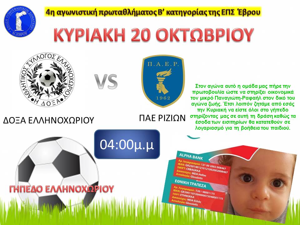Σε μια ακόμα κίνηση στήριξης στον Παναγιώτη – Ραφαήλ θα προβεί ομάδα της ΕΠΣ Έβρου, σύμφωνα με την ανακοίνωση της Δόξας Ελληνοχωρίου τα έσοδα από τα εισιτήρια του αγώνα Δόξα Ελληνοχωρίου – ΠΑΕ Ριζίων για την 4η αγωνιστική του Βορείου Ομίλου της Β’ Κατηγορίας ΕΠΣ Έβρου ο οποίος θα διεξαχθεί το απόγευμα της Κυριακής, θα διατεθούν υπέρ του μικρού Παναγιώτη Ραφαήλ που δίνει μάχη για να κρατηθεί στη ζωή.