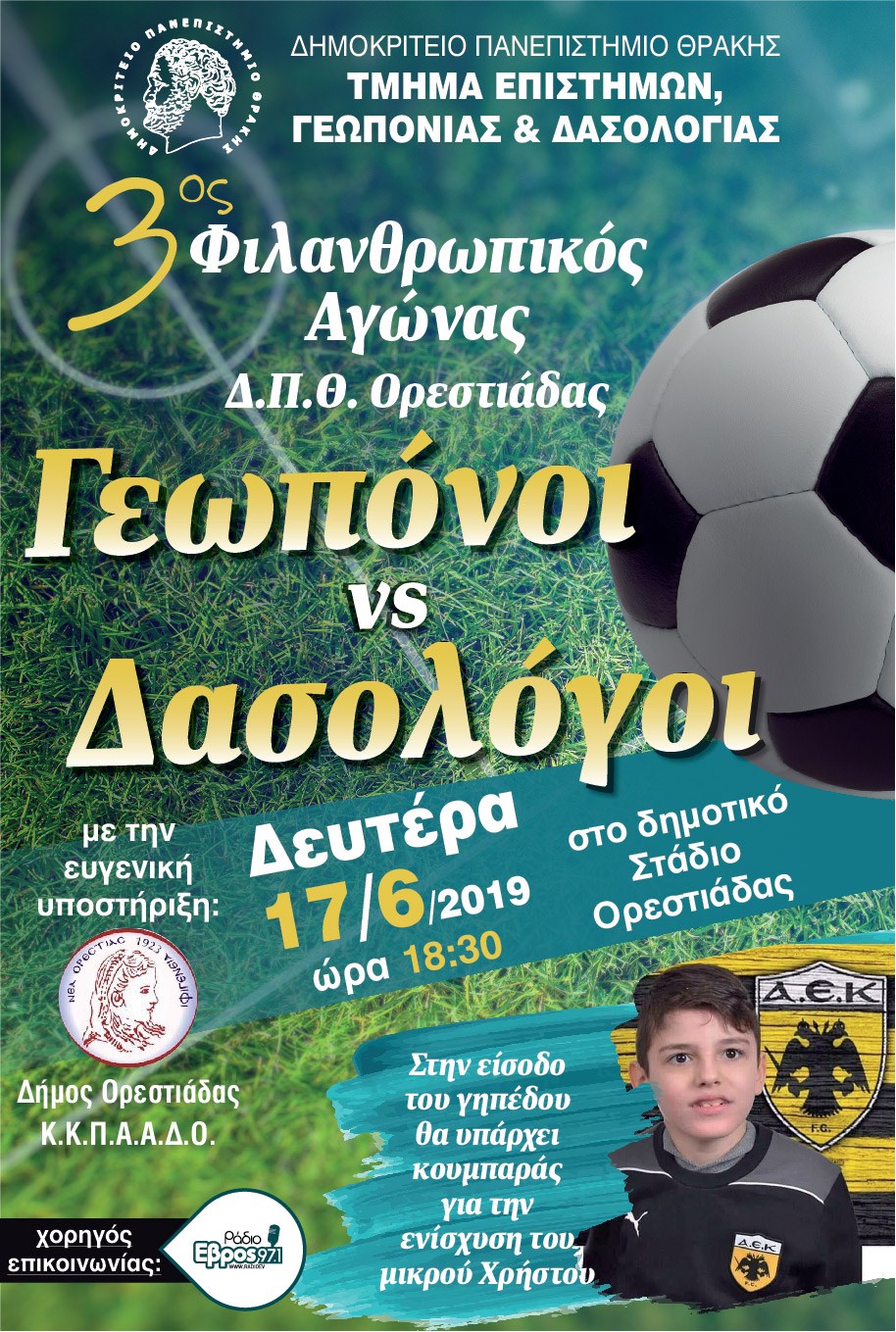 Ο Σύλλογος Φοιτητών της Σχολής Επιστημών Γεωπονίας & Δασολογίας Ορεστιάδας διοργανώνει με την υποστήριξη του Κ.Κ.Π.Α.Α.Δ.Ο. και του Δήμου Ορεστιάδας τον 3ο Φιλανθρωπικό Αγώνα Δ.Π.Θ. στις 17/6/2019 και ώρα 18:30 στο Δ.Α.Κ. Ορεστιάδας! Οι Δασολόγοι αναμετρούνται με τους Γεωπόνους, στην είσοδο θα υπάρχει κουμπαράς στήριξης του Μικρού Χρήστου ! Για την ιστορία οι Δασολόγοι είχαν πάρει την νίκη στα δύο προηγούμενα παιχνίδια που είχαν διεξαχθεί και πάλι για φιλανθρωπικό σκοπό (δείτε περισσότερα εδώ και εδώ)!