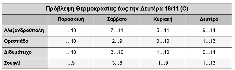 Πιο αναλυτικά, για σήμερα Παρασκευή προβλέπονται νεφώσεις με παροδικές ασθενείς βροχές οι οποίες μετά το μεσημέρι θα σταματήσουν. Η θερμοκρασία θα φτάσει το μεσημέρι τους 13 βαθμούς στην Αλεξανδρούπολη, τους 10 σε Ορεστιάδα και Διδυμότειχο και τους 9 βαθμούς Κελσίου στο Σουφλί. Οι άνεμοι θα πνέουν από Βόρειες-Βορειοανατολικές διευθύνσεις με ένταση 3-4 μποφόρ ενώ μέσα στην ημέρα θα ενισχυθούν και θα αγγίζουν στα ηπειρωτικά τα 4-5 και στα θαλάσσια τμήματα τα 6 και τοπικά ίσως και τα 7 μποφόρ.