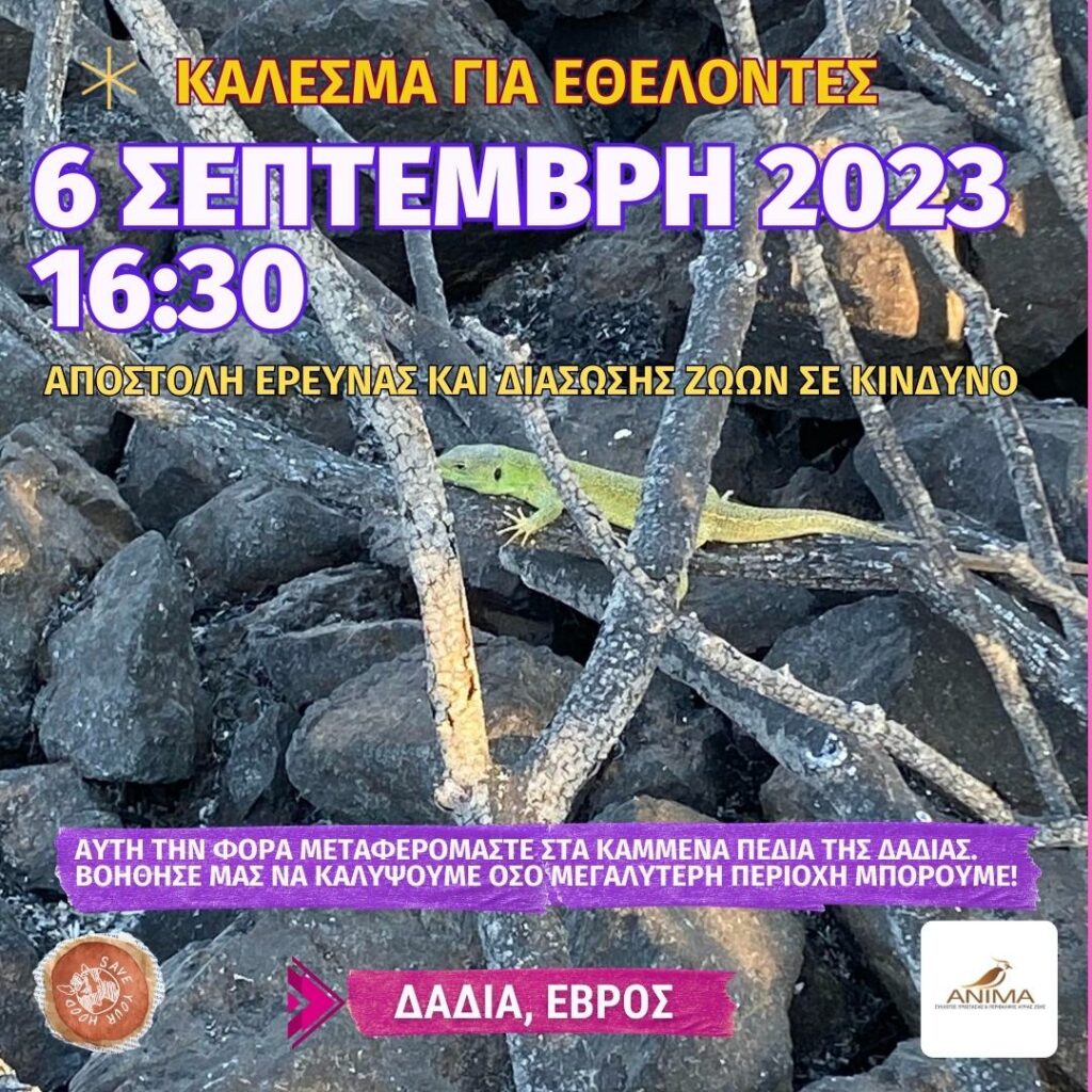 Την Τετάρτη 6 Σεπτεμβρίου 2023 στις 16:30, συγκεντρωνόμαστε για πρώτη φορά σε μια άλλοτε ειδυλλιακή περιοχή του δάσους της Δαδιάς με ένα σκοπό: Την αναζήτηση και διάσωση ζωών που επέζησαν οριακά από την πύρινη λαίλαπα που χτύπησε την περιοχή.