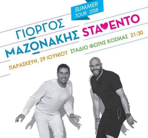 Γιώργος Μαζωνάκης και Stavento ξεσηκώνουν την Αλεξανδρούπολη! Η πιο καυτή νύχτα του καλοκαιριού έρχεται στο στάδιο Φώτης Κοσμάς. Μετά την πετυχημένη συνεργασία του Γιώργου Μαζωνάκη με τον Μιχάλη (ΜΕΘ) Κουϊνέλη που υπογράφει τους στίχους και τη μουσική στο καινούργιο του single, «Αγαπώ Σημαίνει», ο αγαπημένος τραγουδιστής μαζί με τους Stavento, σε καλοκαιρινή περιοδεία σε όλη την Ελλάδα.
