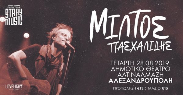 Γνωστός για την αυθεντική, γεμάτη συναίσθημα, σκηνική του παρουσία και την αμφίδρομη σύνδεσή του με τον κόσμο, ο Μίλτος έρχεται στην Αλεξανδρούπολη , με πολλή διάθεση, έτοιμος για μια αξέχαστη βραδιά.