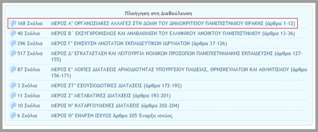 Από τα 168 σχόλια, η συντριπτική πλειοψηφία καταφέρεται ενάντια στο Άρθρο 9 που αφορά στην αναδιάρθρωση και μετονομασία της Σχολής Κλασσικών και Ανθρωπιστικών Σπουδών και τη συγχώνευση Τμημάτων. Επίσης, πολλές αντιδράσεις προκαλεί και το Άρθρο 8 για την ίδρυση Τμήματος Εργοθεραπείας στην Κομοτηνή, το οποίο όμως εντάσσεται στη Σχολής Επιστήμης Φυσικής Αγωγής και Αθλητισμού, ενώ οι αντιδρούντες υποστηρίζουν πως η Εργοθεραπεία ανήκει στις Επιστήμες Υγείας και δεν έχει καμία σχέση με τη συγκεκριμένη Σχολή της Κομοτηνής.