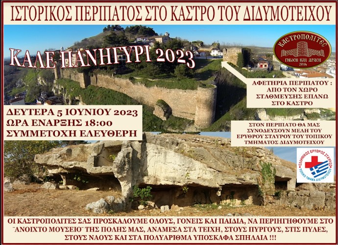 Ο Ιστορικός και Πολιτιστικός Σύλλογος Διδυμοτείχου «ΚΑΣΤΡΟΠΟΛΙΤΕΣ- Γνώση και Δράση» συμμετέχει στο εορταστικό πρόγραμμα της πόλης «Καλέ Πανηγύρι 2023» με δύο εκδηλώσεις :