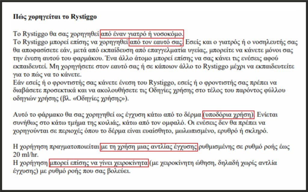 Η καταγγέλλουσα πάσχει από βαριά μυασθένεια (Myasthenia Gravis), ένα σπάνιο αυτοάνοσο νόσημα που προκαλεί έντονη μυϊκή αδυναμία και μπορεί να επιφέρει αναπνευστικές και καταποτικές δυσκολίες. Για την περίπτωσή της έχει εγκριθεί από τον ΕΟΠΥΥ εβδομαδιαία ενέσιμη θεραπεία με το εξειδικευμένο και πολύ υψηλού κόστους φάρμακο Rystiggo, το οποίο χορηγείται με απλή υποδόρια έγχυση, ακόμη και κατ’ οίκον μετά από βασική εκπαίδευση – όπως εύκολα μπορεί να διαπιστώσει κανείς ανατρέχοντας στις οδηγίες χρήσης του.