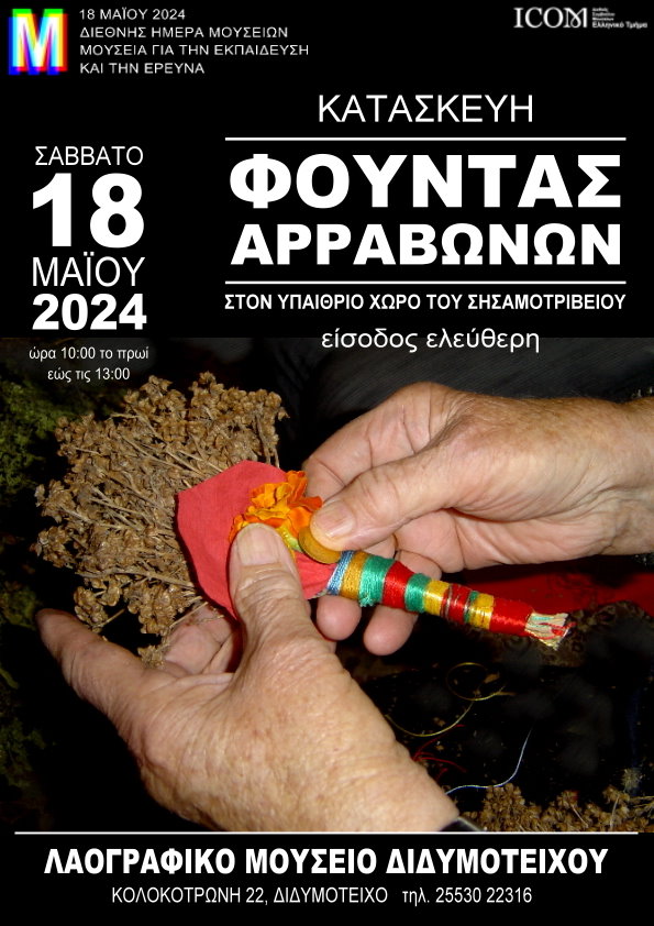 Ο Μορφωτικός Σύλλογος Λαογραφικού Μουσείου Διδυμοτείχου στα πλαίσια του εορτασμού των ΕΛΕΥΘΕΡΙΩΝ της Πόλης του Διδυμοτείχου και συμμετέχοντας στον εορτασμό της διεθνούς ημέρας Μουσείων παρουσιάζει την κατασκευή “Πειστηρίου Αρραβώνων” (Φούντα) των παρέβριων χωριών του Διδυμοτείχου.