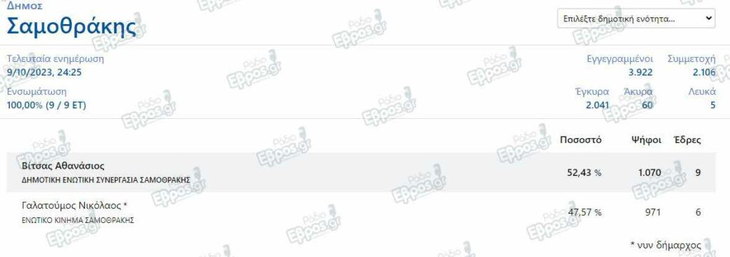 Επανέρχεται στην θέση του Δημάρχου ο Αθανάσιος Βίτσας στην Σαμοθράκη με μια “καθαρή” νίκη καθώς ήδη από νωρίς ξεκαθάρισε το αποτέλεσμα και η διαφορά σε σχέση με τον Ν. Γαλατούμο.