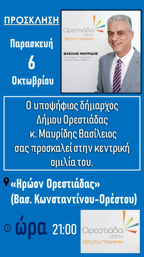 Την Παρασκευή 06/10 στις 21:00 η κεντρική ομιλία του Βασίλη Μαυρίδη στο Ηρώον Ορεστιάδας (Βασιλέως Κωνσταντίνου-Ορέστου)