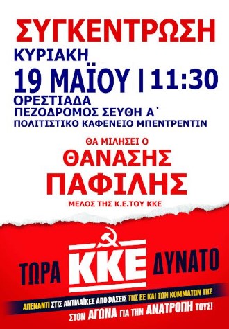 Η Τομεακή Επιτροπή Έβρου του ΚΚΕ καλεί σε ανοιχτή πολιτική συγκέντρωση, για τις Ευρωεκλογές της 9ης Ιούνη, την Κυριακή 19 Μαΐου στις 11.30 π.μ. στην Ορεστιάδα, στο πολιτιστικό καφενείο «Μπεντρεντίν», στον πεζόδρομο Σεύθη Α’.