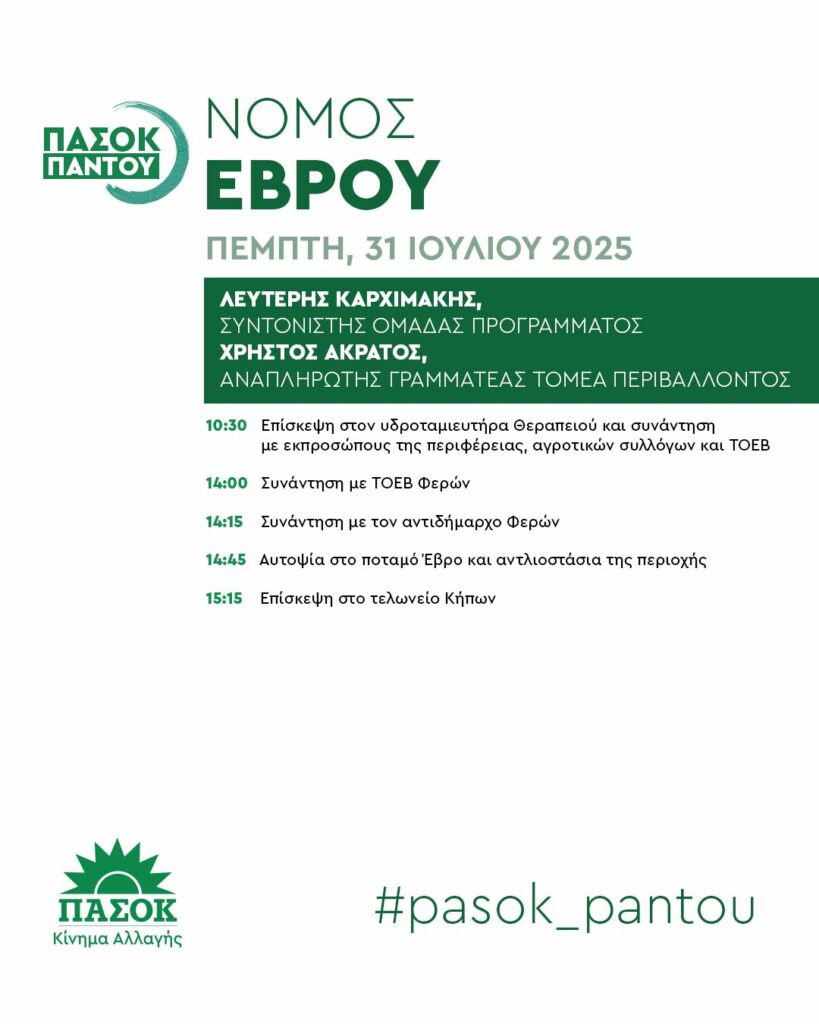 Την Πέμπτη 31 Ιουλίου κλιμάκιο του ΠΑΣΟΚ με επικεφαλής τον Λευτέρη Καρχιμάκη, συντονιστή της ομάδας προγράμματος και τον Χρήστο Ακράτο, αναπληρωτή γραμματέα του τομέα περιβάλλοντος, τους οποίους θα συνοδεύουν μέλη της Νομαρχιακής Επιτροπής του Νομού και της Κεντρικής Επιτροπής, θα πραγματοποιήσει τα παρακάτω: