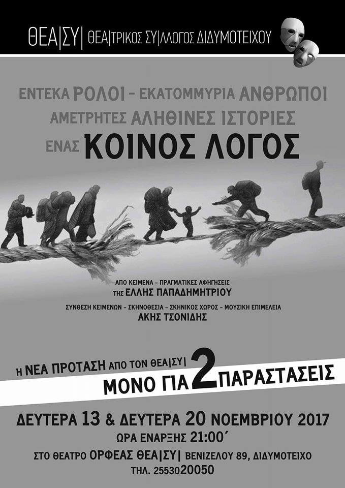 Για δύο παραστάσεις, την Δευτέρα 13 και Δευτέρα 20 Νοεμβρίου 2017, με ώρα έναρξης 21:00 στο θέατρο “ΟΡΦΕΑΣ” (Βενιζέλου 89, Διδυμότειχο)