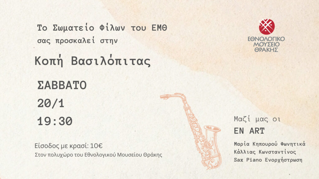 Το Σωματείο Φίλων του Εθνολογικού Μουσείου Θράκης σας προσκαλεί στην τομή της βασιλόπιτας το Σάββατο 20/1 στις 19:30 στον πολυχώρο του ΕΜΘ.