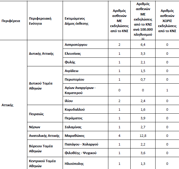 Κρούσματα λοίμωξης από τον ιό του Δυτικού Νείλου έχουν καταγραφεί και διερευνηθεί σε 34 δήμους της χώρας, σε 18 περιφερειακές ενότητες, και συγκεκριμένα στις περιφερειακές ενότητες: Δυτικής Αττικής, Δυτικού Τομέα Αθηνών, Πειραιώς, Νήσων, Ανατολικής Αττικής, Κεντρικού Τομέα Αθηνών, Βόρειου Τομέα Αθηνών, Ηλείας, Αχαΐας, Αιτωλοακαρνανίας, Έβρου, Λάρισας, Καρδίτσας, Τρικάλων, Άρτας, Πέλλας, Ημαθίας και Κορινθίας.